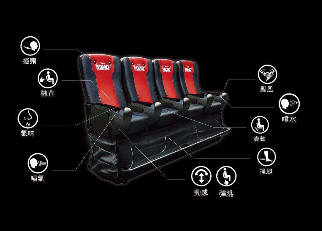 MediaMation MX4D動感影廳為電影場景提供座椅搖晃、左右移動、振動和風雪、熱氣、噴霧、香氣、閃電、泡泡等12種特效,讓觀眾能在觀影中身歷其境,體驗與眾不同的立體觀影感受。